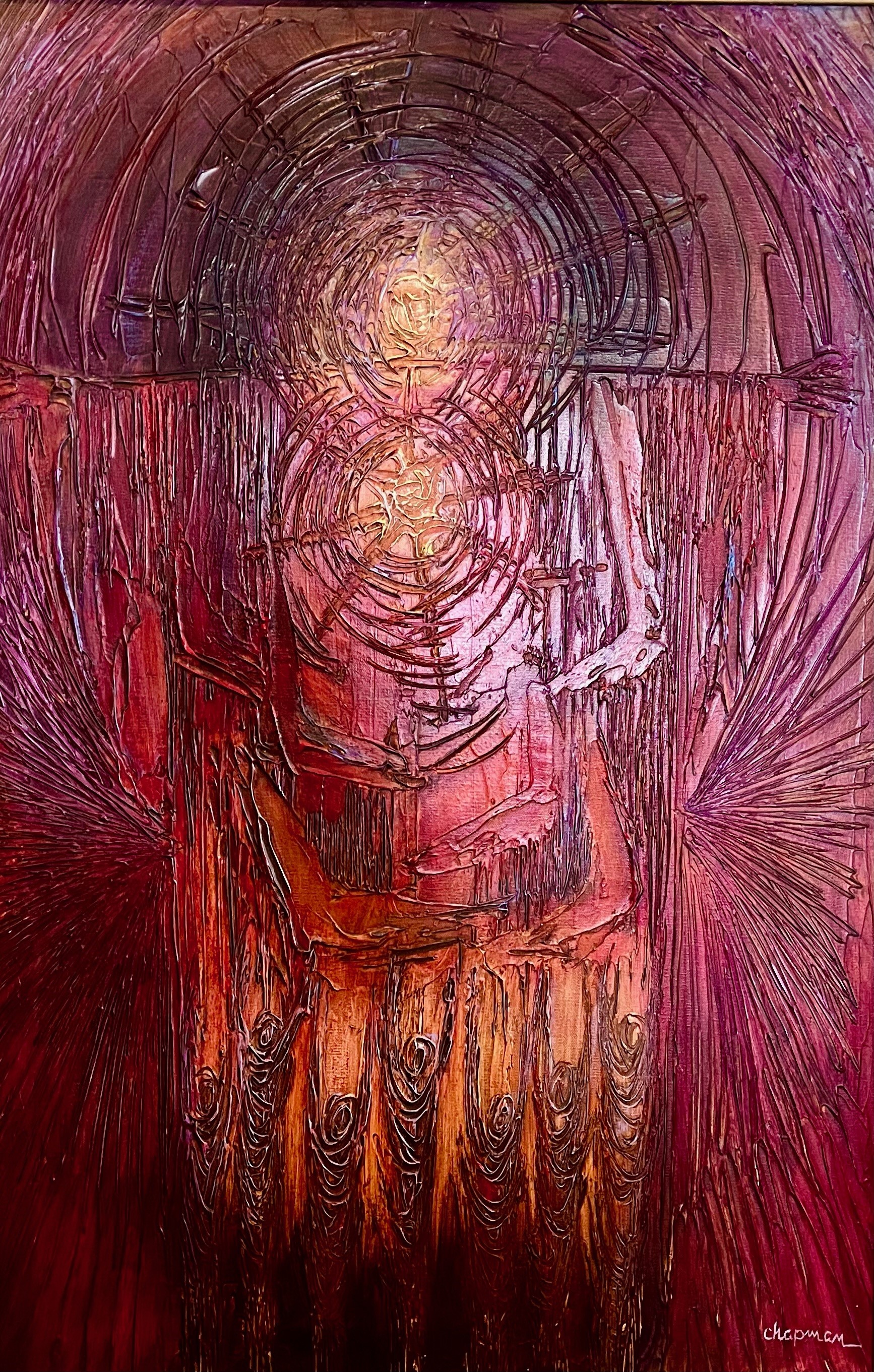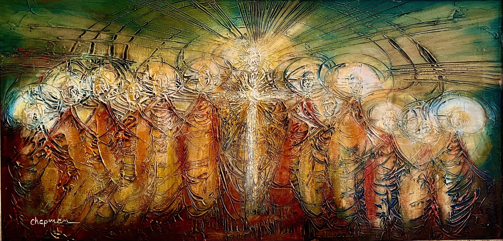 Brother Chapman’s story is posted on the website: www.cbartfoundation.art. The influence of Pierre Teilhard de Chardin on the artist’s works was evident in his Catholic University master’s thesis on the days of creation. On large canvases his dynamically sculptured paintings portray moments in an evolutionary process with cosmic dimensions. He found inspirations in the images arriving from the space exploration of the 60’s and 70’s.